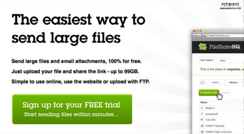 (如上图)FileShare HQ网页上的行为请求按钮告诉用户成为会员能够得到的好处——几分钟内上传文件。