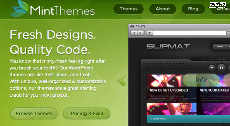 (如上图)MintThemes网页上的行为请求按钮没有用高调的手段来呼吁用户的注意,而是采用了留白的形式,这同样能够刺激用户采取行动。网页上方和底部的行为请求按钮都是采用了这种方式。