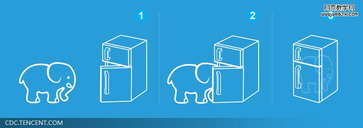 开篇呈上赵本山和宋丹丹的小品笑话:要把大象放进冰箱总共分几步?把大象塞进冰箱要3步:1 把冰箱门打开;2 把大象装进去;3 把冰箱门带上。这虽是一则脑筋急转弯的笑话,但却提炼出我们生活中将一个物体放进另外一个物体里通常有的3个步骤。