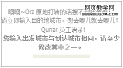 如下图所示:Qunar当地址选择相同出发和到达地时,会跳转页面显示提示,提示内容如下。业界对于这种的类型的提示信息有不同的看法,有人喜欢这种比较人性化生动的描述信息,但也有人喜欢更为简明扼要的提示。个人认为人性化生动的描述是可取的,但是简明扼要的原则依然需要遵循,至少我们能在最短的时间就找到自己的错误,并且知道怎么去修改。