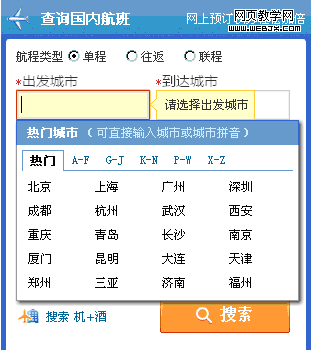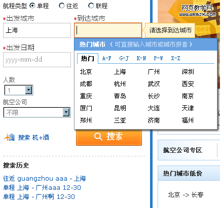 如下图所示:Ctrip提示框的错误提示明显遮住了到达城市的填写项而下方的热门城市联想框也同时出现遮住了大部分的填写区域。这个做法严重的干扰了其他搜索项的填写。当然设计师的考虑角度可能是希望减少用户操作,当其出错的时候可以直接进行地址的选择和修改。