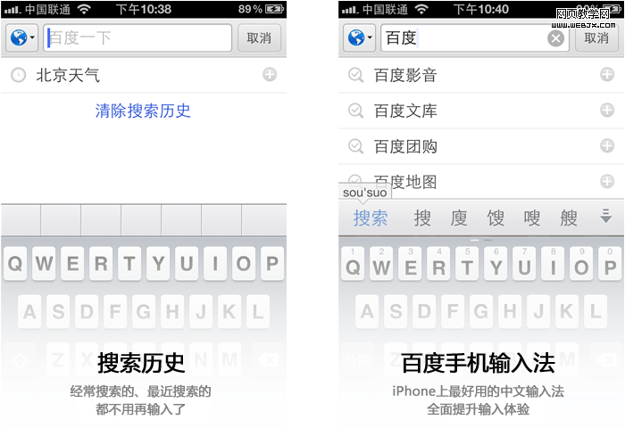 更快的输入搜索体验百度搜索交互体验设计的首要环节是输入。从输入的方式来说,目前有按键输入、语音输入、拍照输入。大多数用户还在使用按键输入,我们着重进行体验分析。现状:在iPhone手机中,内置的输入法在输入中文多个字的关键词时效率不高,输入法联想词无法满足用户输入精准联想的需求。字母键盘中国人还是不大习惯。iOS5之前的自带输入法,联想词跟随光标。