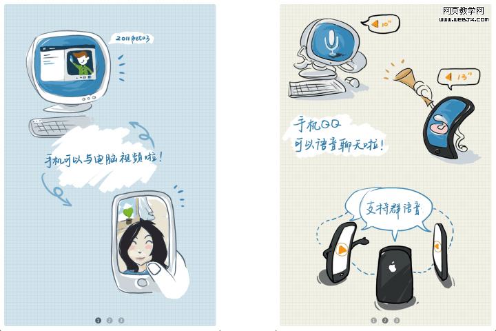 QQ2011 for iPhone安装后的新功能介绍页面,个人非常喜欢这种轻薄的画风,这里采用有趣生动的手绘漫画风格,比起方方正在实线实面的绚丽图形介绍更有亲和力。