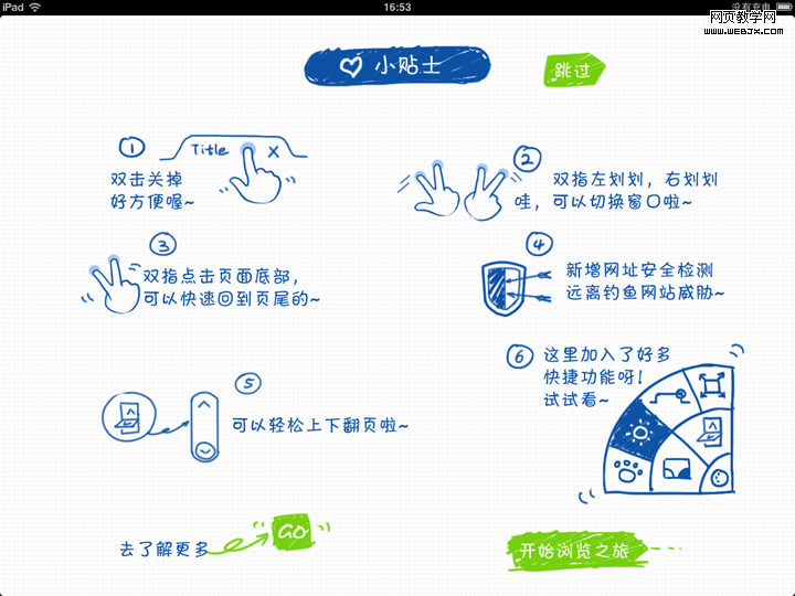 QQ浏览器HD版的小贴士,比起普通的图文帮助介绍,这个手绘的介绍界面更让用户能够接受和有兴趣阅读它。