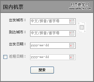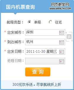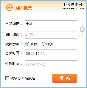 大多数机票查询的入口,都是这样,单程/往返使用两个radio,放在最前面;选择单程时禁用往返,或者隐藏返程时间输入框。