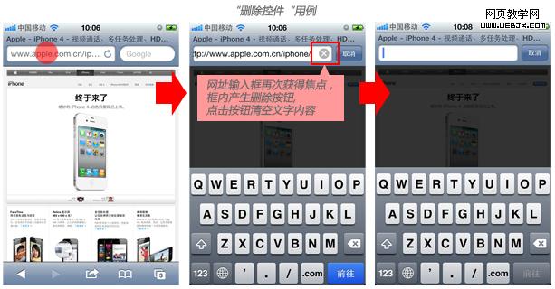 浏览器地址栏中的“地址输入框”常常需要用户将其清空重新输入新的地址,因此当已有内容的地址栏获得焦点时,在输入框内增加一个清除按钮,方便用户快速的清空现有内容,开始新的内容输入。