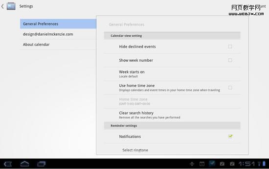 iPad的设置通常是点击一个“i”按钮而跳出弹窗,设置类别被细分为一些容易识别的列表。Android则有不同的方式。它看上去更像iOS的“常规设置”界面,用户导航在左,详情显示在右。这是蜂巢系统的多个设置方式中的首选,也是较为优雅的一种。