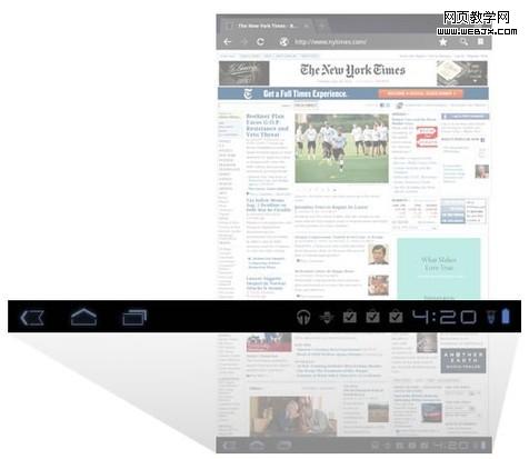 虽然iOS平台将系统栏做的尽量小,但是Android Honeycomb 扩大了系统栏的尺寸并包含通知和软导航按钮。其中包括返回按钮、主页按钮和最新应用程序按钮。