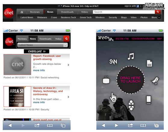 通过结合移动终端的控件特性,可以在较小的尺寸范围内完成导航的再设计。如上图cnet移动网站中,导航内搜索框用搜索按钮代替,二级项目改用下拉选择器,充分利用了移动端控件特性。