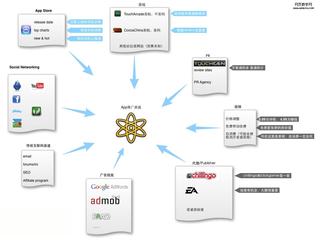 如下图所示,进行移动应用的推广主要有以下途径: