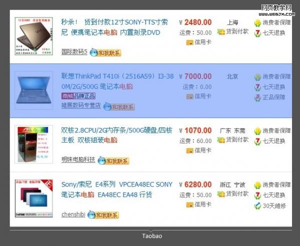 而将横向的行内信息再次扩充就成了如同淘宝商品页一样的,行区分弱化的表格形式,既满足了丰富信息的呈现,也能很快速的进行与行之间的如同价格等关键信息的对比。