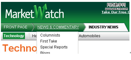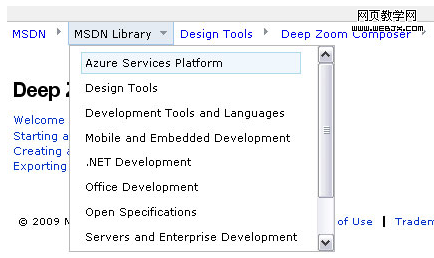 MSDN的面包屑导航。 打开一个可滚动的子导航,列表的用户将鼠标悬停在链接。