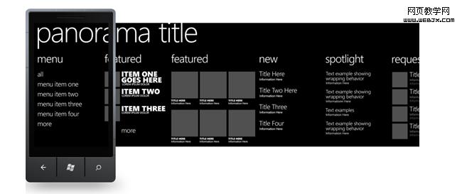 滑动的世界—流畅的不会迷失的导航 极其扁平的信息构架,WP7是一个滑动的世界,他会引导用户尽量通过滑动去切换去导航。全景视图是WP7特有的交互形式之一,它一般应用于app的第一层级。画卷式的操作形式,既给用户带来了方便流畅的操作体验,也给APP本身带来了更宽广的空间。