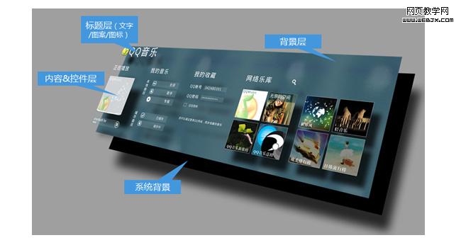 全景视图下原则上是支持所有控件的。再加上这个视图本身的广阔的空间,为这里提供了无限的可能性。上图是QQ音乐mango1.1版的全景布局。它不仅让用户在滑动中就可以完成一级导航的任务。由于其独特的空间特色,可以安排更多的内容,使整个信息的构架更加扁平。所以其适合应用于结构关系比较复杂的APP。