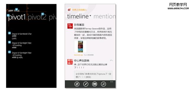 Pivot是WP7比较创新的一种页签的操作形式,由标题,页签和内容组成。滑动内容和页签都可以进行页签切换操作,同时也支持点击直接切换页签。