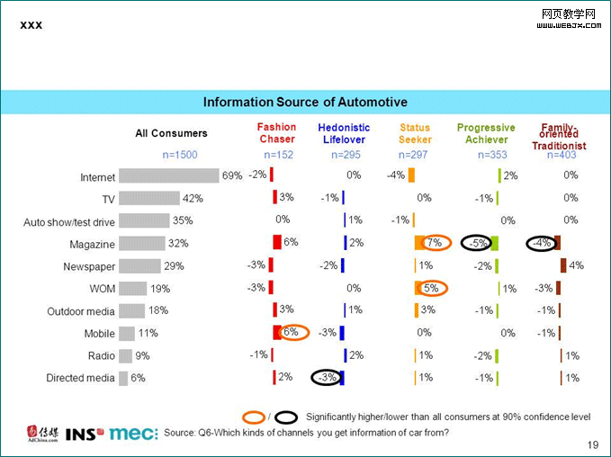 这五类消费者在收集汽车相关资讯时所用的媒介也迥然不同。由于这份报告是基于过去3个月中浏览过汽车资讯的网民的网上调查,因此不难想象他们在互联网的使用率上有所偏重,高达69%。电视(42%)和车展/试驾(35%)在作为汽车信息源上居亚军和季军。潮人型消费者更喜欢使用手机上网来浏览汽车资讯。炫耀型消费者在口碑和杂志的媒介依赖性显著高于平均。与之相反的是,奋斗型和居家型消费者不太会从杂志中寻找汽车资讯。