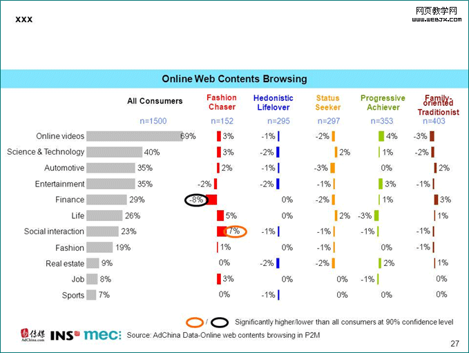 在上网浏览行为方面,潮人型消费者更喜欢浏览社交网站上的内容,而较少看财经类网站的资讯;享乐型消费者的网上浏览比率总体都低于平均;奋斗型消费者更偏爱视频类网站;居家型消费者比其他类型人群更喜欢财经类内容。