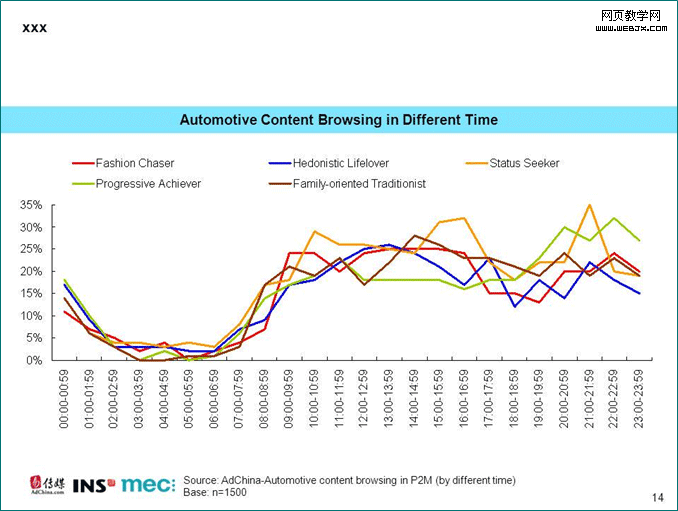 汽车类资讯网站的浏览高峰期也因人群而异。炫耀型消费者整体上比其他类型的人群更愿意浏览汽车相关的内容。早上10点至11点之间、下午4点至5点间和晚上9点至10点间是他们的浏览汽车类资讯的黄金时间。奋斗型消费者则倾向于在晚上浏览汽车相关信息,汽车资讯浏览量在晚上8点到9点,10点至11点到达高峰。