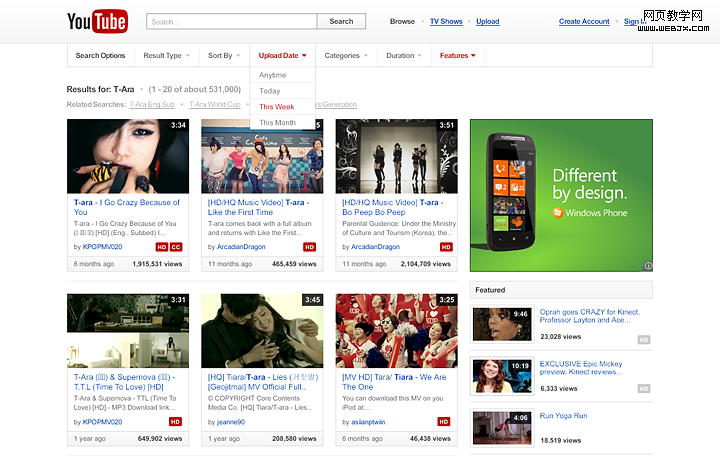 搜索结果页的另一个变化是搜索筛选项。Youtube当前版本需要点击才能展开搜索筛选项,而展开后又占用过多空间。所以下图设计对搜索筛选项进行了整合,直接展示在搜索结果顶部。