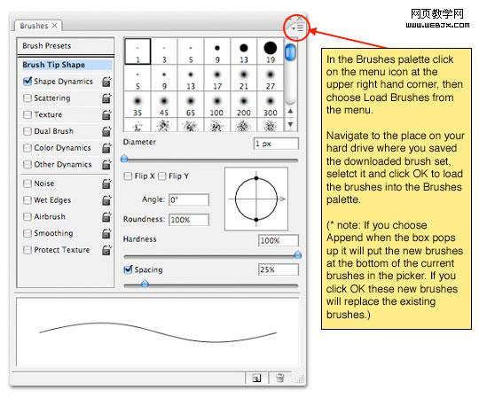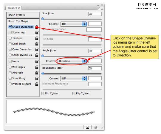 精髓到了,在笔刷选项中选择形状动态选项,并在角度选项中选择方向。这两部是非常重要的,这样这条V字的笔刷镜像就会按照真实自然的方向延展下去。