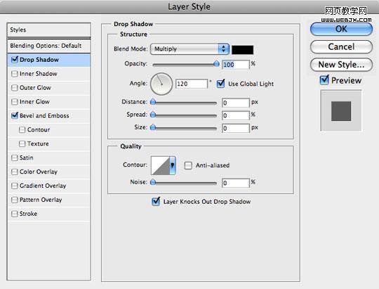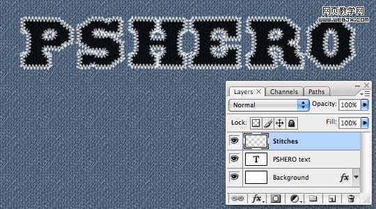 现在为路径描边生成的缝线制作一些体积感,使用投影效果和浮雕效果可以实现。