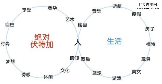 然后左边以“绝对伏特加”为圆心画了个圆,右边以“生活”为圆心画了个圆。两个圆形的切点正好是“人”,于是,绝对伏特加、人、生活三者的关系就一目了然了。我们想要将“绝对伏特加”这圈感性的东西传递给“人”,并获得“人”的认可,那我们需要将“人”的“生活”这圈他所熟悉的可以给他感性的东西进行关联。