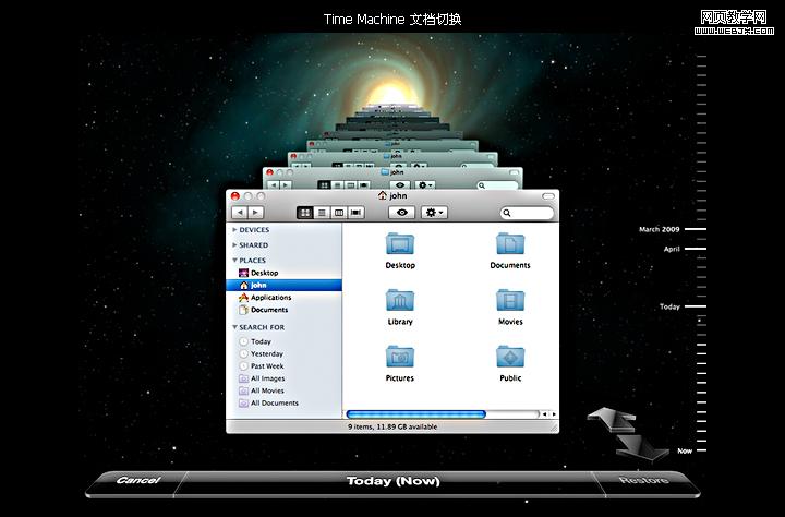在页面布局发生变化时,使用恰当的动画可以使变化显得不那么唐突,向用户解释刚才到底发生了什么以及所处状态的变化。例如苹果的Time Machine在切换不同时间的文档预览时,会有前后堆叠的动画效果,以更好的呈现先后逻辑关系。