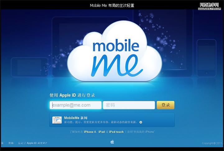 信息的主次轻重,可以通过比例、颜色、声音等来对比呈现,以保证用户不会被杂乱无章的信息分散了注意力。例如苹果MobileMe的大器设计,巨大的icon占据了大半个屏幕、制造最强的品牌感染同时明确用户身处何方,登录框、产品介绍链接按钮占其次,登录方式说明、相关页面链接最弱,主次关系随着用户来到页面→最常用操作(登录与查看功能)→获取补充信息的顺序递减。
