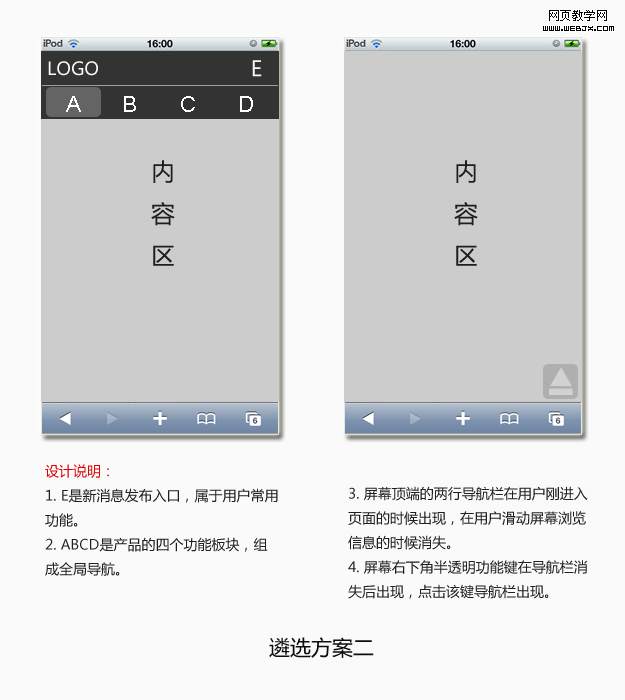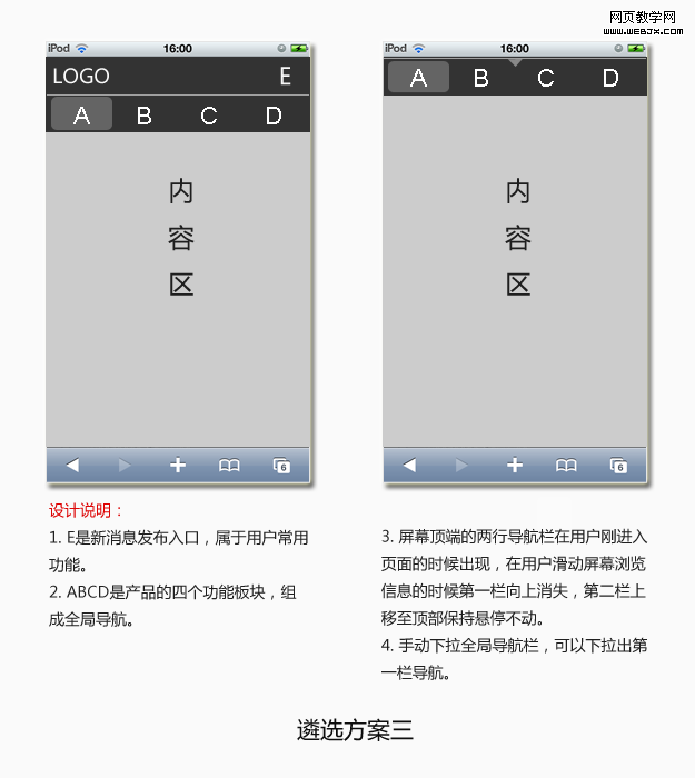 基于项目的实际需要以及对竞品分析的思考总结,设计师尝试了3款导航设计方案,并对每一款方案的优劣之处进行了详细分析。