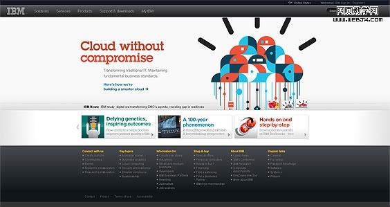 简约的页面风格容易收到用户的喜欢,而且能给用户带来一定的安全感。拿IBM这个来说,页面给人的第一感觉是专业和安全。焦点图构成也比较简单,左侧醒目的标语用了简单的渐变,右侧也运用了简单的几何图形。