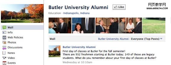 毕业生的力量总是非常强大的。而Butler大学与众不同的是,他们的毕业生Page只有一个,而不是按照社团或者年份做不同的Page。毕业生们可以在Page下创建自己的群(Group),其最大的妙处是你可以有机会所有的毕业生们分享活动,或者一些毕业生正在做的特别的事的新闻。