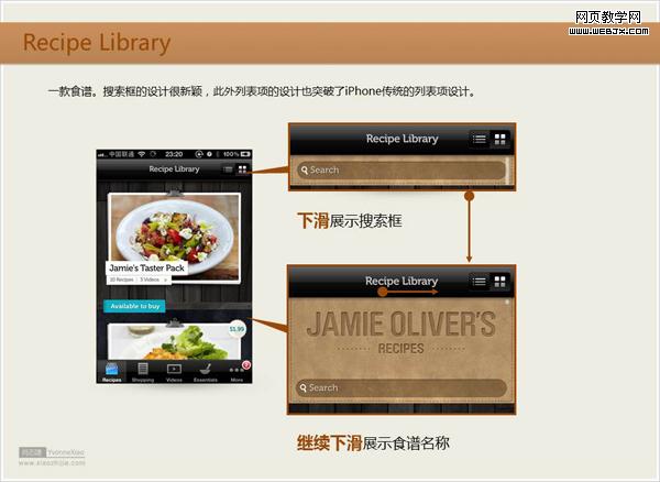 另外Recipe Library的搜索框隐藏,就挺有风度的,并且继续上移展示软件名称的设计,能够很好的提升自己的品牌感知。