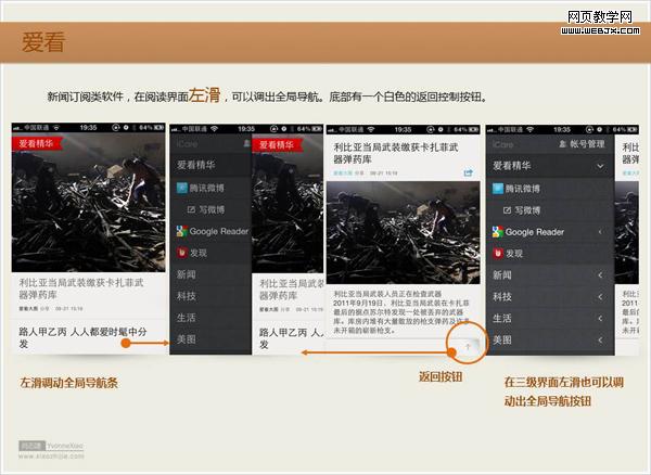 任何时候有一个全局的导航条,能够快捷导航是一个设计理想。但是对于有第三第四第五层级的应用软件来说,在次级页面有个固定的位置摆放全局导航,不免有点影响其它操作任务,爱看给出了解决问题的一个很好思路,可以放置于左侧,通过向右滑屏展开,既不影响子页面的操作任务,又能够解决全局导航问题。
