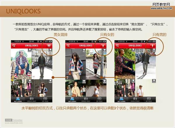 对于一个界面分为两个TAB的设计有时的确让人困惑,UNIQLOOKS在次级导航的设计很有新意,但是前提是次级导航并不是那么的重要,且用户不会平凡切换。