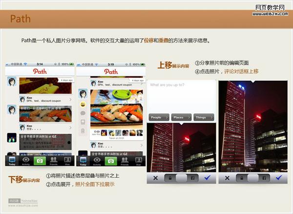 交互有一个可怕的定律叫“漏斗法则”,意思是尽量减少操作步骤和界面跳转,每增加一个操作步骤或者界面切换,就有可能流失10%的用户。位移与信息叠加的设计模式,在不跳转的情况下,通过内容移位,能够合理展示更多的信息,扁平化信息架构,在操作者产生交互的地方,就近通过这种方式就完成了轻便的操作。Path、with/、myPANTONE便是通过内容移位与信息叠加的模式来展示信息的比较有趣的软件。