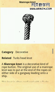 KnotGuide在同一页上显示了绳结的示意图和解说。过长的解说文字需要先隐藏一部分,拖动浏览全部。为了让用户知道将来能够去哪里(3),它给文字的底部蒙了一层半透效果,以暗示还有一部分没展示,可以继续往下看。同时,在刚进入该页面时,文字区右侧的scrollbar会短暂显示2~3秒,再消失,这也能起到同样的暗示效果(这可能是Android平台内置的默认效果)。