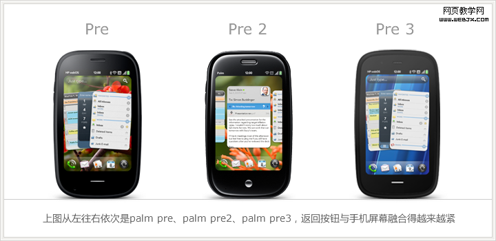 上图从左往右依次是Plam pre、palm pre2、palm pre3,返回按钮与手机屏幕融合得越来越紧凑