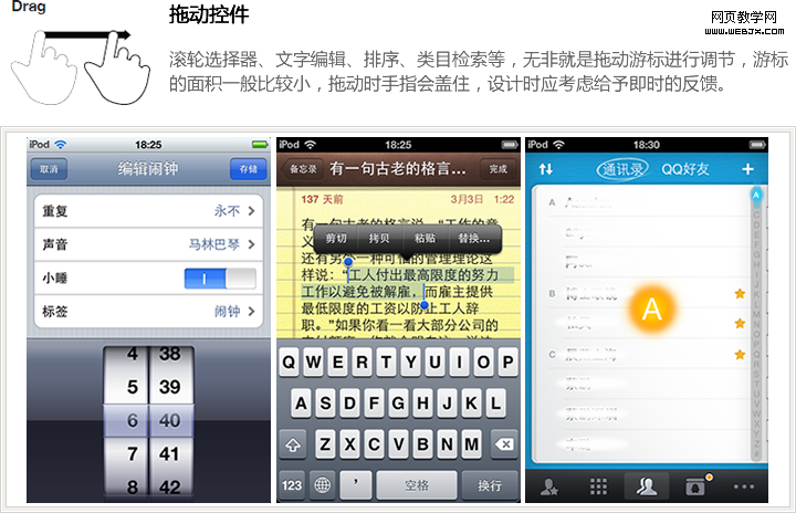 手势操作快速轻便,但没有鼠标按下时didadida声的安全感,也十分受限于设备屏幕的灵敏度,所以操作反馈的作用至关重要。例如icon按下时的响应,这里除了没有mouse over的效果,其他三态和PC端是一致的,缺一不可。除此之外还要考虑的是操作区太小被手指遮挡住的情况,反馈一定要明显,并呈现在可视范围内。比如QQ通讯录的姓名检索操作。除了视觉反馈声音也是一种有效的反馈方式,比如iPhone发送SMS发送成功的声音。新浪微博的feed拉取,tweetbot等,都巧妙的运用了声音反馈。