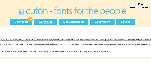 Cufón在主页上提供了一个字体转换工具,它能将你选择的字体转换为SVG,并为你创建一个Javascript文件,你需要在html中引用它。Nettuts+的Jeffrey Way曾写过一篇关于如何在你的网页中集成Cufón的step-by-step优秀教程。