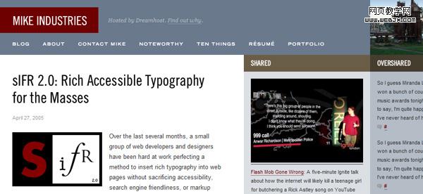 sIFR已经出现了好一段时间了。当我们确实除了图片没有其他选择时,它第一个出现了,提供了一个很有效的引入非标准字体的方法。sFIR(即Scalable Inman Flash Replacement)结合使用了Flash和Javascript来将页面上的文本修改为Flash元素。sIFR有许多优点,例如文本保持了对屏幕读者的可用性,也可以被选择。