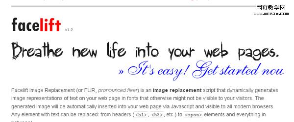 FLIR(即Facelift Image Replacement)和sIFR类似,除了它使用Javascript和PHP来生成图片,而不是使用Flash来替换文本。这种方法明显的好处是,你不需要花时间为每一段你想用自定义字体的文本创建单独的图片。如果你觉得用另一种字体或者颜色,更新你网站的文本也会更容易一些。