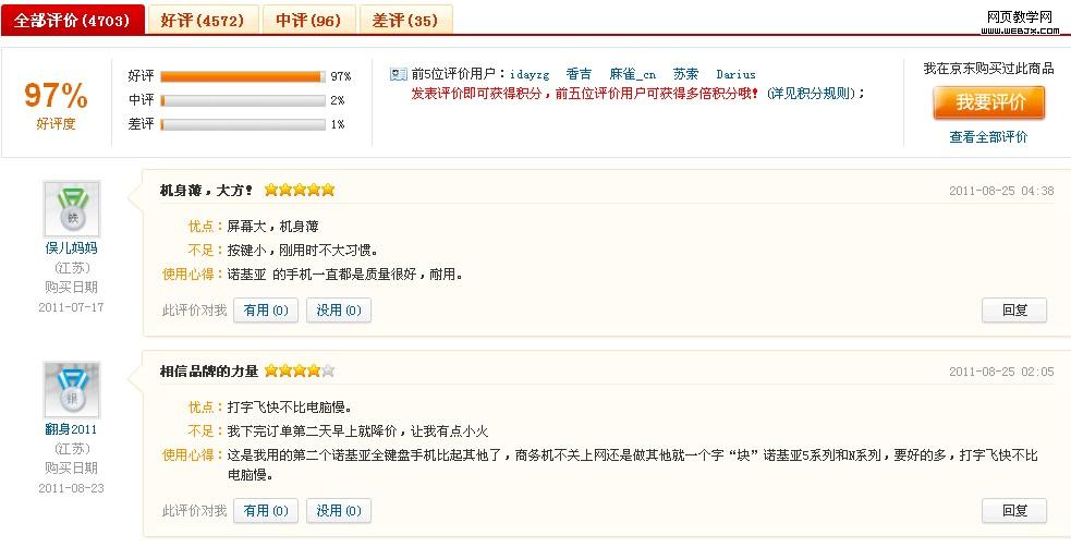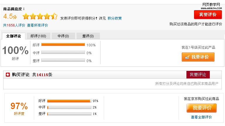 京东和一号店把好中差评的百分率也展示出来,比星级评分更加直接易懂。