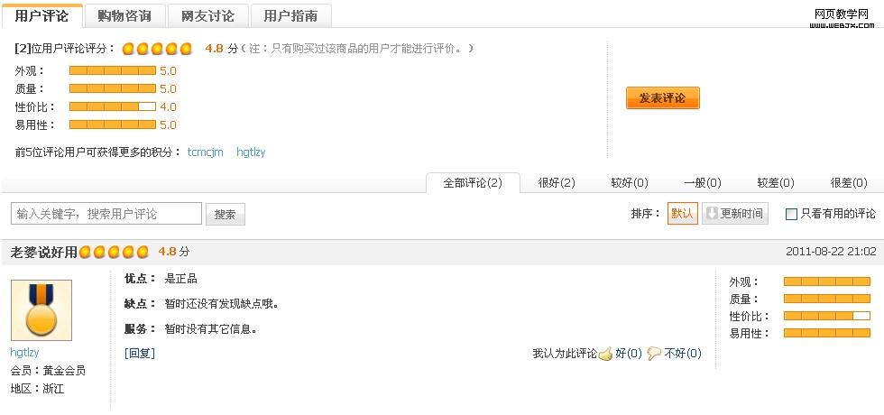这种评论模块,给出了每种商品的综合评分,可以在整体感知到商品的优劣。如淘宝、当当、红孩子、麦考林,都采取了这种形式。不过每个网站也都有些自己的特点。