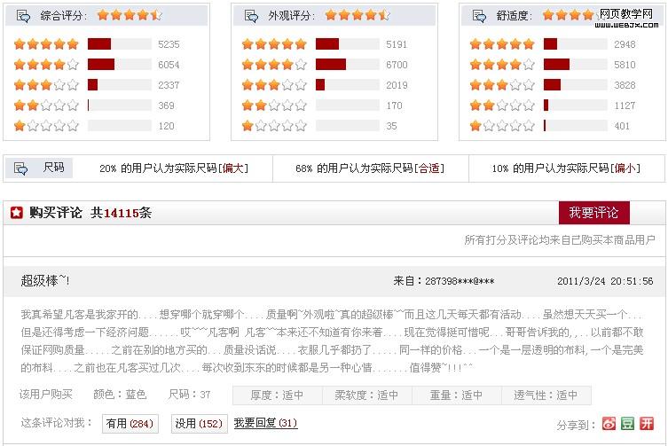 最典型的例子就是凡客。将评分细分为外观评分和舒适度,每一项都有一个总体评分还把评分的分布也列了出来。在尺码方面,也有特别的强调,对于服装来说,不能试穿如何选到合适的尺码,这一点的强调也是很有价值的。