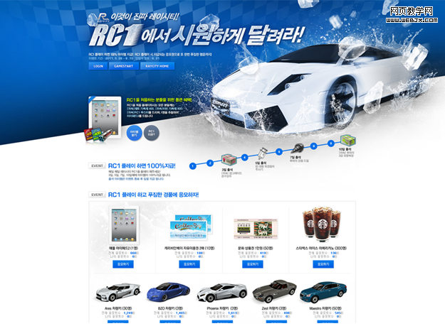 上图,将背景旋转后,大面积的斜面产生了很强的速度感,赛车急速飞驰着,好像下一秒就要从电脑中冲出来一样,倾斜的大标题和旋转后的背景交叉配合,使画面整个都运动起来。这种方法可以应用到很多运动的主题上。