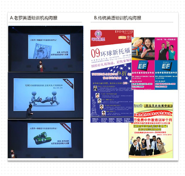 大家先比较一下上面两组海报,A是老罗英语培训机构的海报,B是一些传统的英语培训机构的宣传海报,不知道大家有没有看过老罗的一个励志创业演讲视屏,里边就讲了这一段,老罗说得也没有错,看下海报A,第一个是一个避孕套,文案是:人民币一块钱在今天还能买点什么?或者,也可以到老罗英语培训听八次课,视觉上很抓人眼球,创意挺新颖;第二个,也很干净的三个小人,1280元暑假住宿班打架报名中,创意独到,招生培训这个主题很鲜明,右边这些传统的英语培训机构的海报相比之下显得很土,把老罗这些又干净又有趣的海报放在右边这些传统的海报里边,更醒目,更吸引人,这也是老罗对自己的海报赞不绝口的原因, 于是我拿着这两组海报给我女朋友看,我问他,如果是你看了这两组海报,你会选择哪个培训机构?她说选海报的话很喜欢老罗这一套,但是真选学校的话她还是会选择那个英孚或者环球雅思,也就是右边哪一组。问他原因,他说他们更像学校,感觉更值得信任。