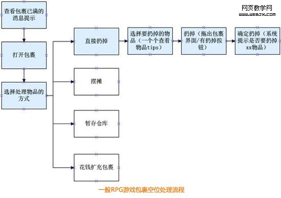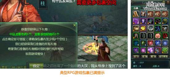 例如:RPG游戏中我们的包裹经常会满,要求及时腾出空位才能安放后面获得的物品。最常规的游戏会有文字提示:需要更多的包裹/包裹已满(让用户自行处理),而此时用户正在很投入地体验某个玩法或任务,这样的提示首先会先打断用户的行为,即使这样的提示,用户也无暇顾及该怎样解决这个问题才最妥当,它的意识里只想这赶紧把不用的物品处理掉,腾出空位安放更好的物品,最简单的方法就是把包裹里不用的物品扔掉。而这样造成的损失已经远不止打断用户的体验“流”严重。