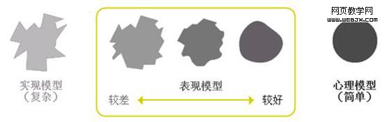 在很多情况下,多可能是件好事。但在交互设计的世界中,正好相反,我们应该不断地在减少界面元素的情况下仍旧保留产品的功能。这是由用户的心理模型决定的。Alan Cooper在其著About Face3: The Essentials of Interaction Design一书中曾经形象地描述过“现实模型”、“表现模型”和“心理模型”之间的关系,用图示说明大概如下: