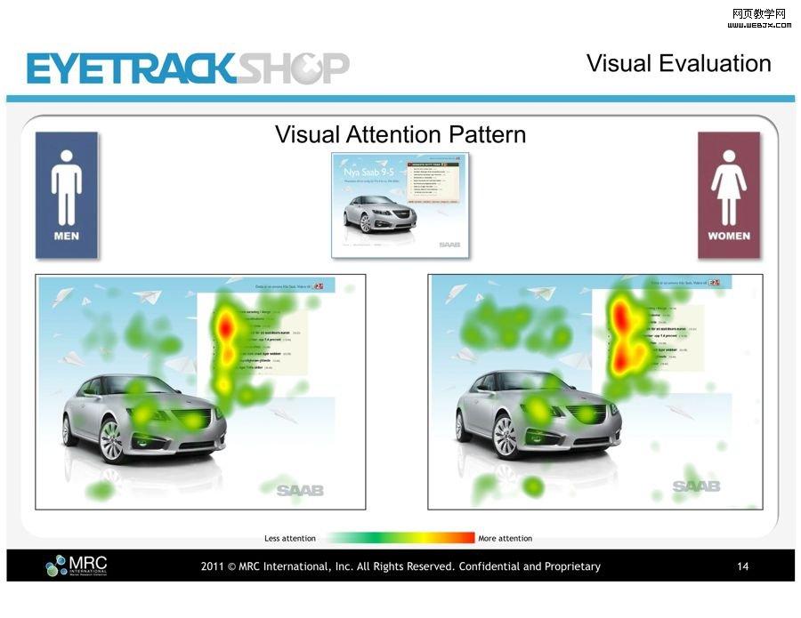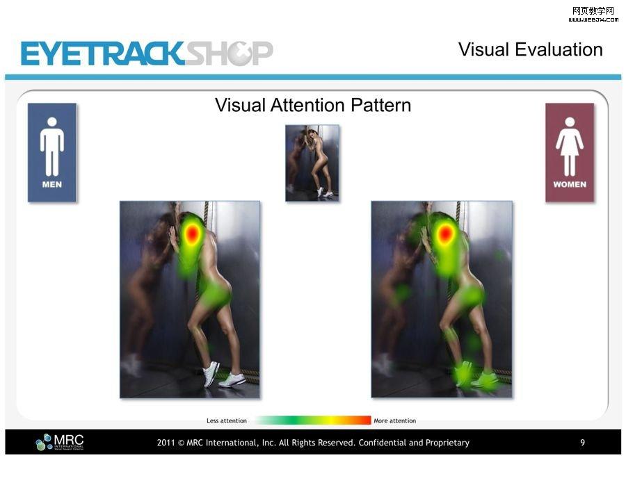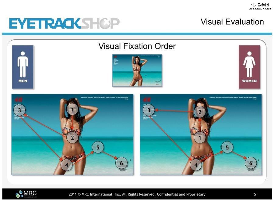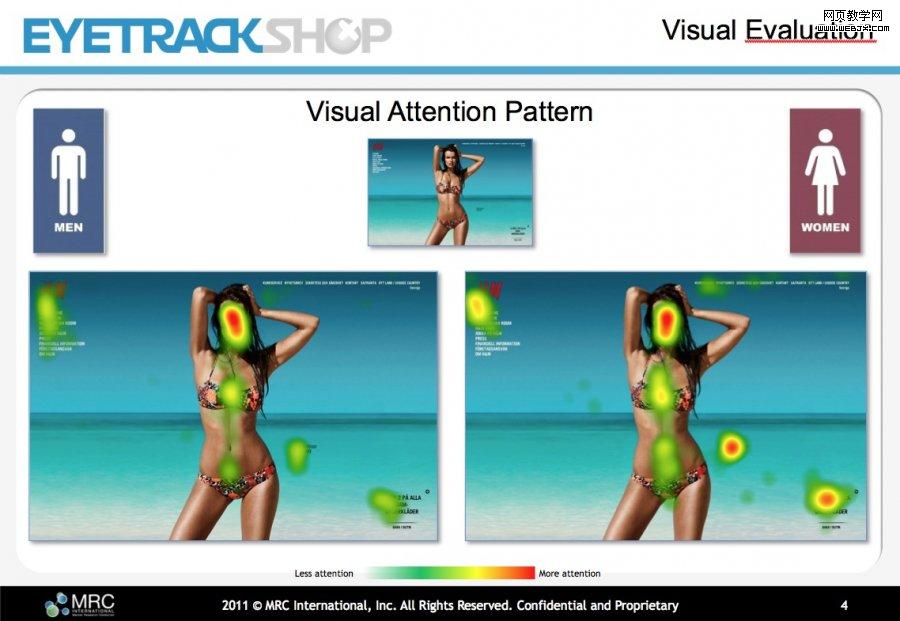 - 这是H&M 的网页,虽然男人和女人都很注重模特儿的脸,但是男人明显比较不注意品牌及文字讯息(越红表示越注意)