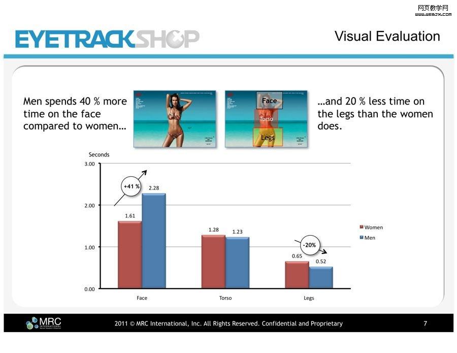 - 和女人相比,男人目光停留在模特儿脸上的时间长了40%,腿上的时间却短了20% (结果是女生更爱看美腿),身体部分则是差不多